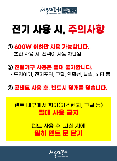 - 캠핑장내에서 전기사용은 불가하며, 화장실 등 시설문 전기를 무단으로 사용할 경우 변상금 부과 및 퇴장 조치됩니다.