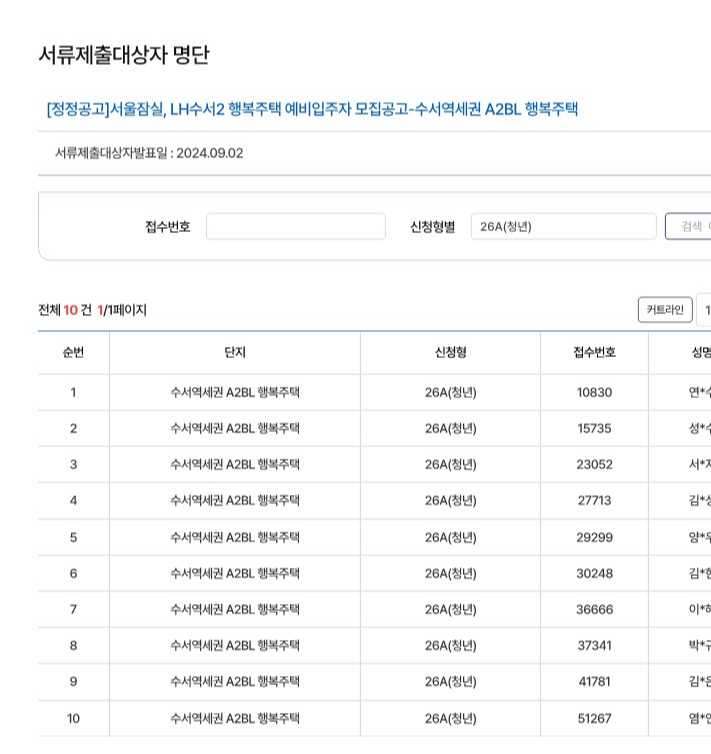 수서역세권 A2BL 행복주택 26A 청년 서류제출대상자 명단