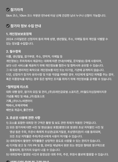 - 참가신청방법: 종목(5km, 10km)선택 -> 티셔츠 사이즈 선택 -> 입력 정보 확인 후 결제 진행