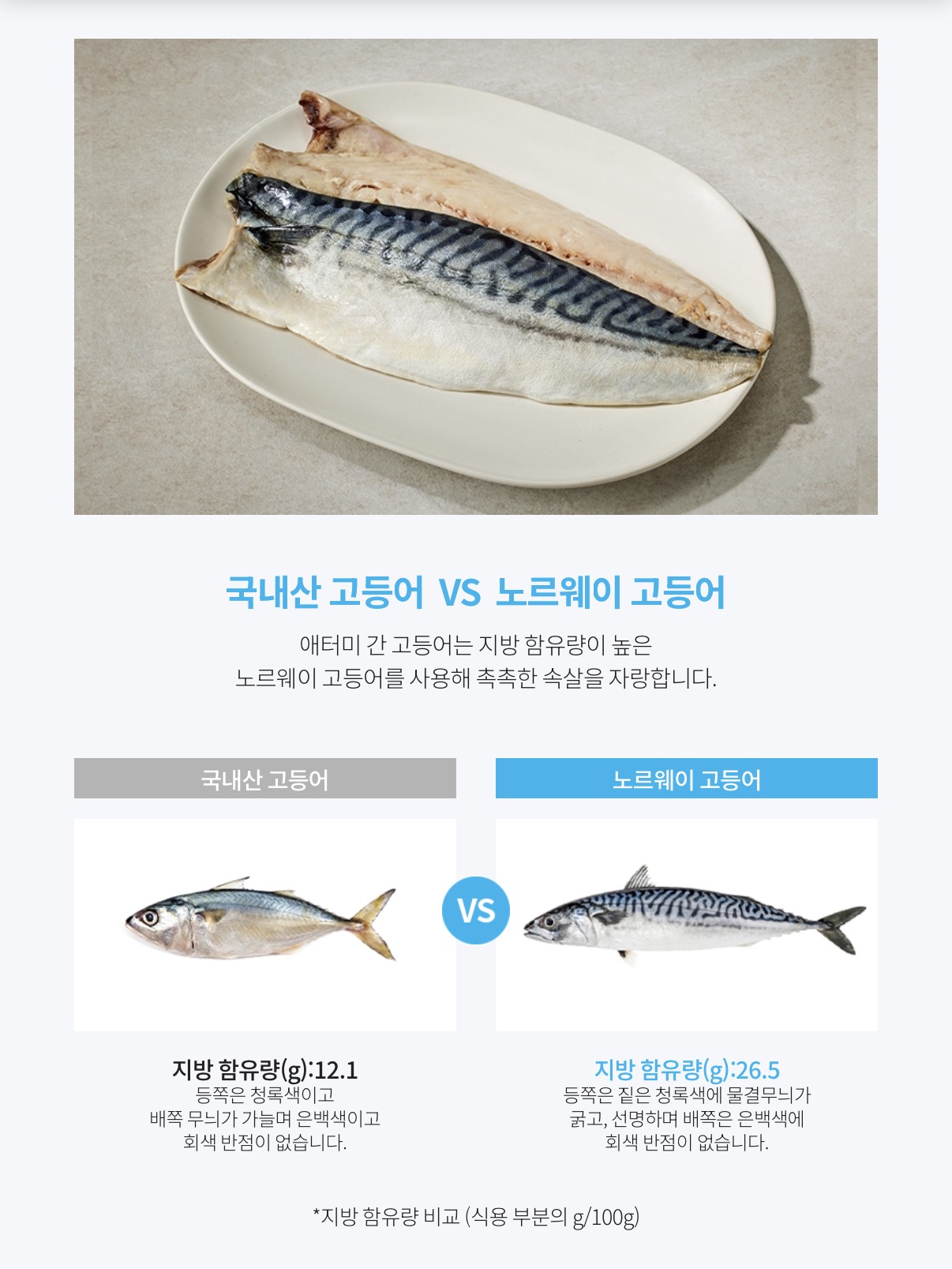 국내산 고등어 약 12.1g 노르웨이 고등어 약 26.5g 지방 함량 차이가 큽니다.