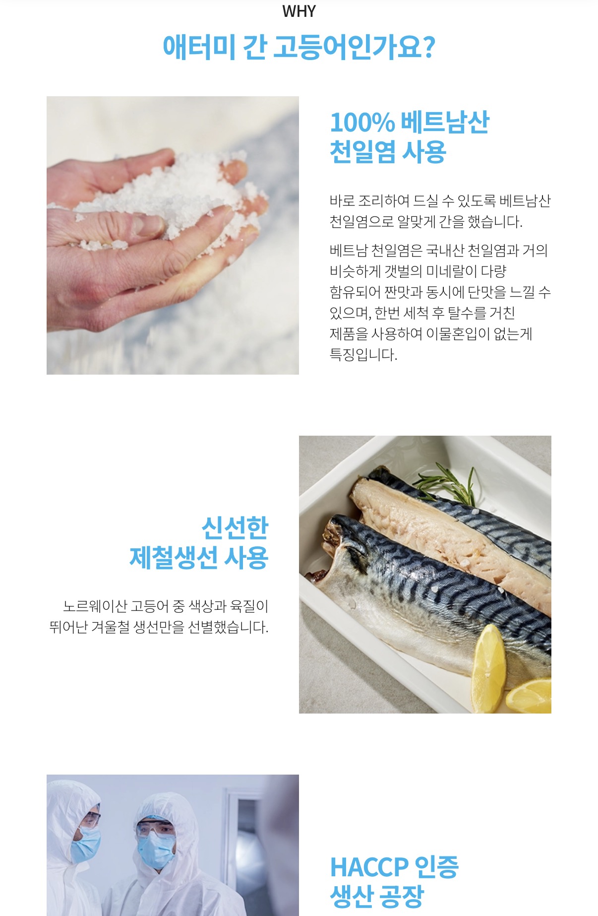 특히 노르웨이산 고등어 사용과 HACCP 공정이 핵심입니다.