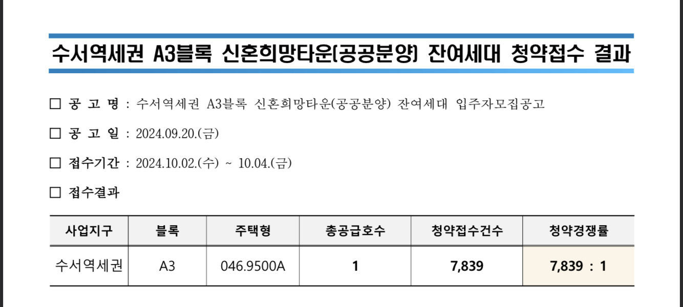 수서 역세권 A3 신혼희망타운 디아크리온강남 공공분양 무순위 청약이 마감되었습니다.