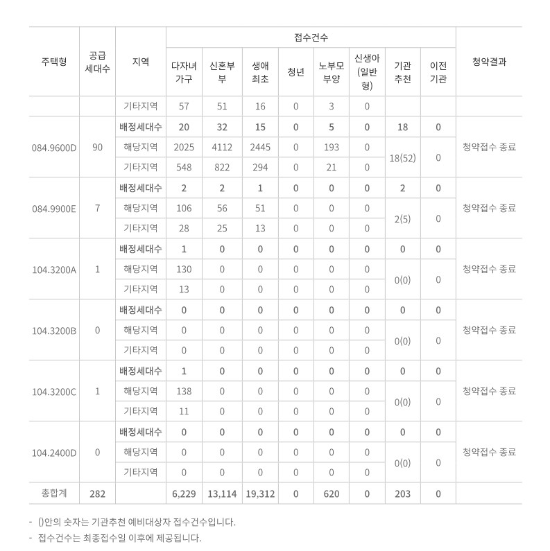 | 주택형 | 공급세대수 | 지역 | 다자녀가구 | 신혼부부 | 생애최초 | 노부모부양 | 기관추천 |
