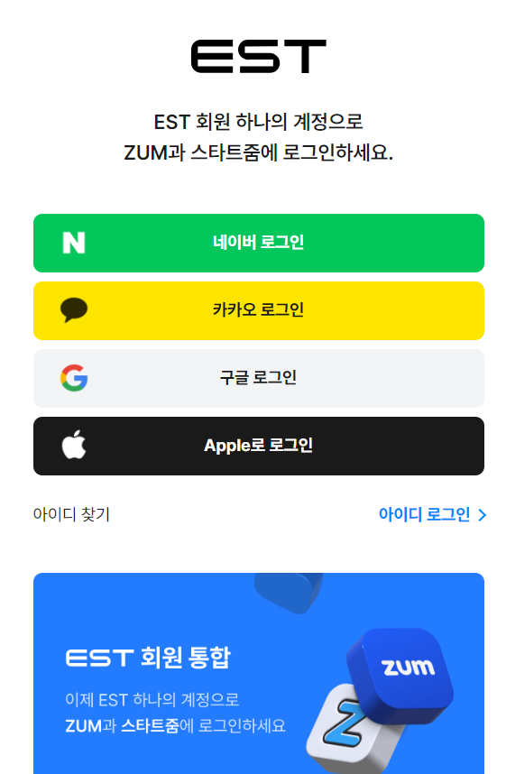 EST 회원통합으로 EST 하나의 계정으로 ZUM과 스타트줌에 로그인할 수 있습니다.