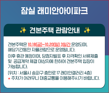이후 휴관 예정이며, 당첨자발표 후 자격확인 서류제출 및 공급계약 체결 대상자에 한하여 견본주택 입장이 가능합니다.