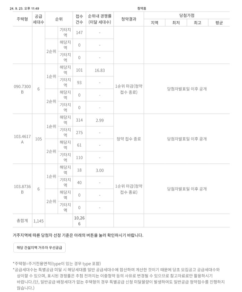 9월 23일 59형, 76형, 103형 타입이 2순위 청약을 실시합니다.