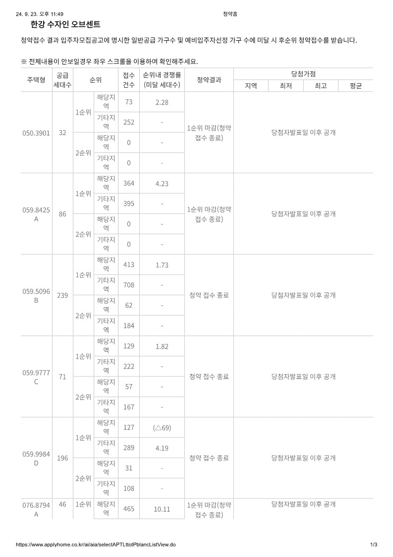 한강수자인오브센트 경쟁률 2순위 59B 59C 59D 76B 103A (2024.09.23)