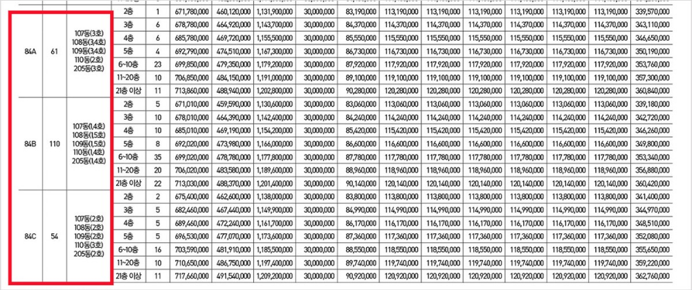 | 타입 | 공급세대 | 분양가 (출처: 호갱노노) |